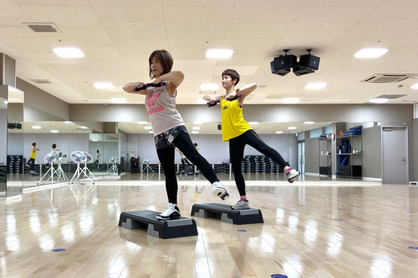 ステップ台の昇降運動とダンベル運動を組み合わせ、肩まわりもスッキリ。