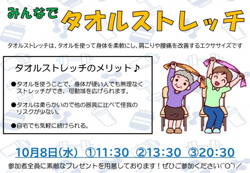 毎週金曜日、たくさんのイベントを用意しております(^O^)/ぜひご参加くださいね😀10月8日(水)にもタオルストレッチを開催します♪タオルをご持参ください🎵