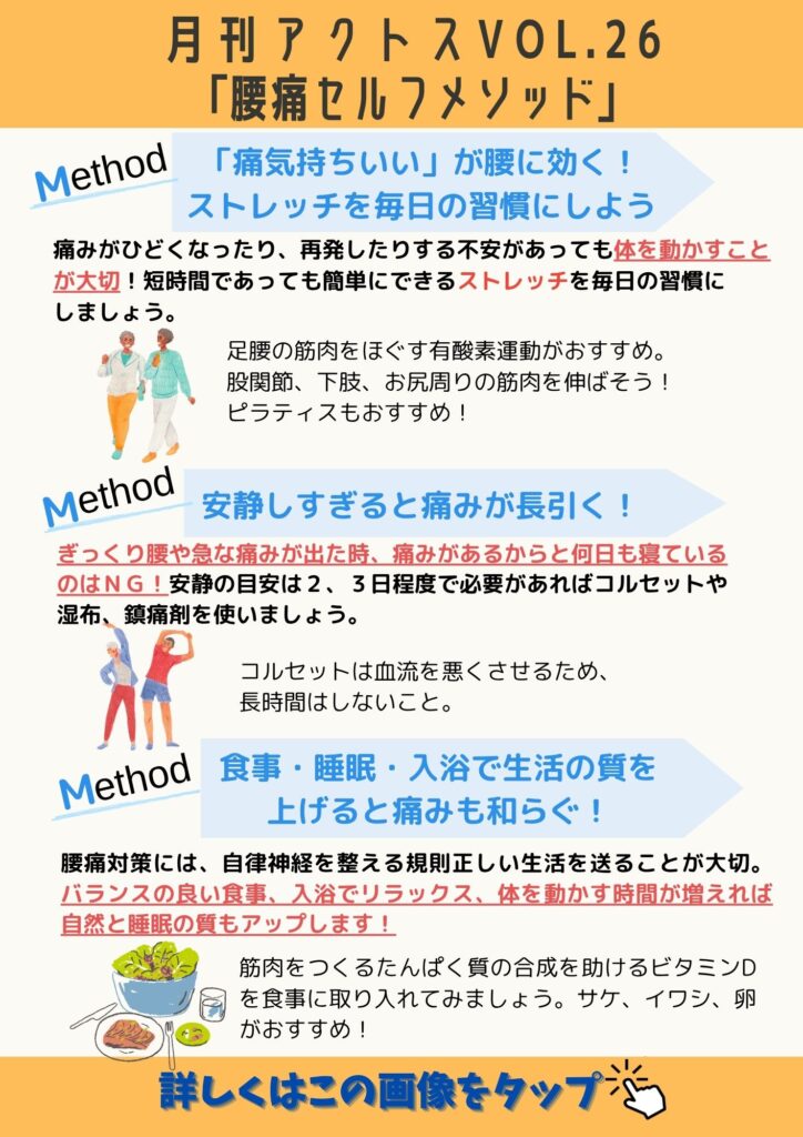 画像にて、自分でできる腰痛セルフメソッドをご紹介しています!メソッドは続けることで効果があります。