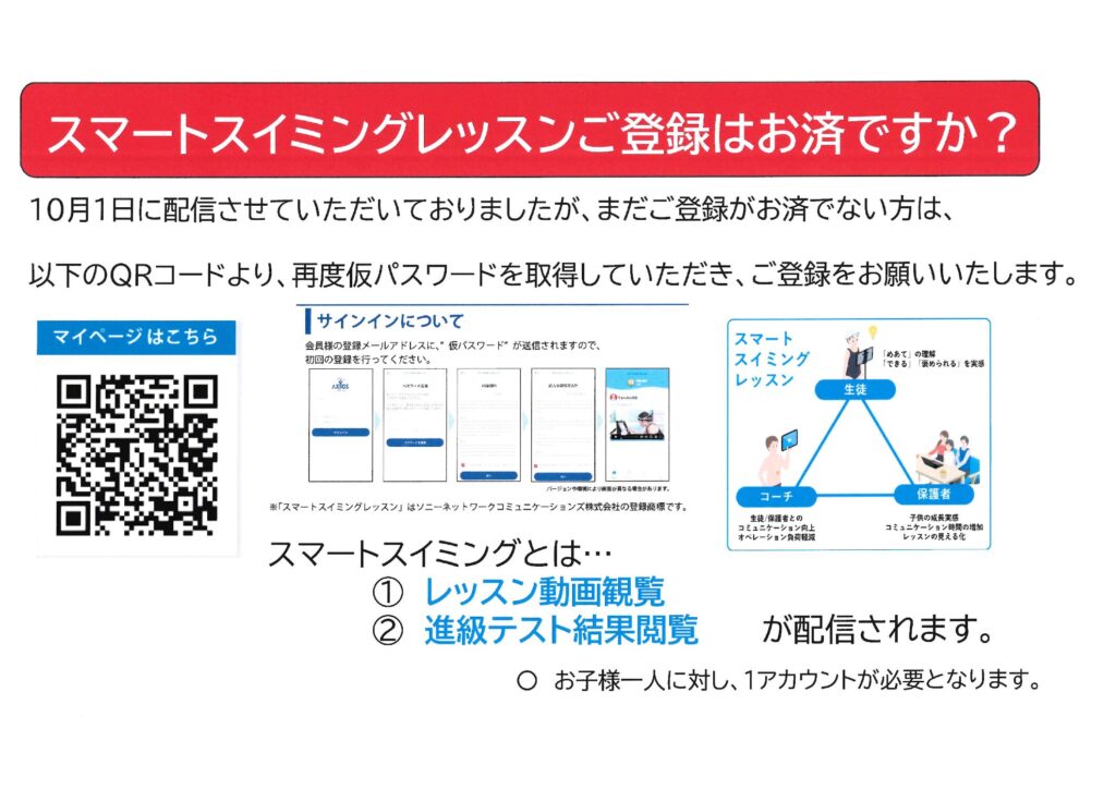 さて、10/1(水)に配信させていただきましたスマートスイミングレッスンの登録に関してのメールをお送りさせていただきましたが、まだ登録がお済みでない方は、以下のQRコードから再度仮パスワードを取得していただきご登録をお願いいたします。スマートスイミングレッスンでの、ご不明な点に関しましてはスイミングコーチまでお願いいたします。