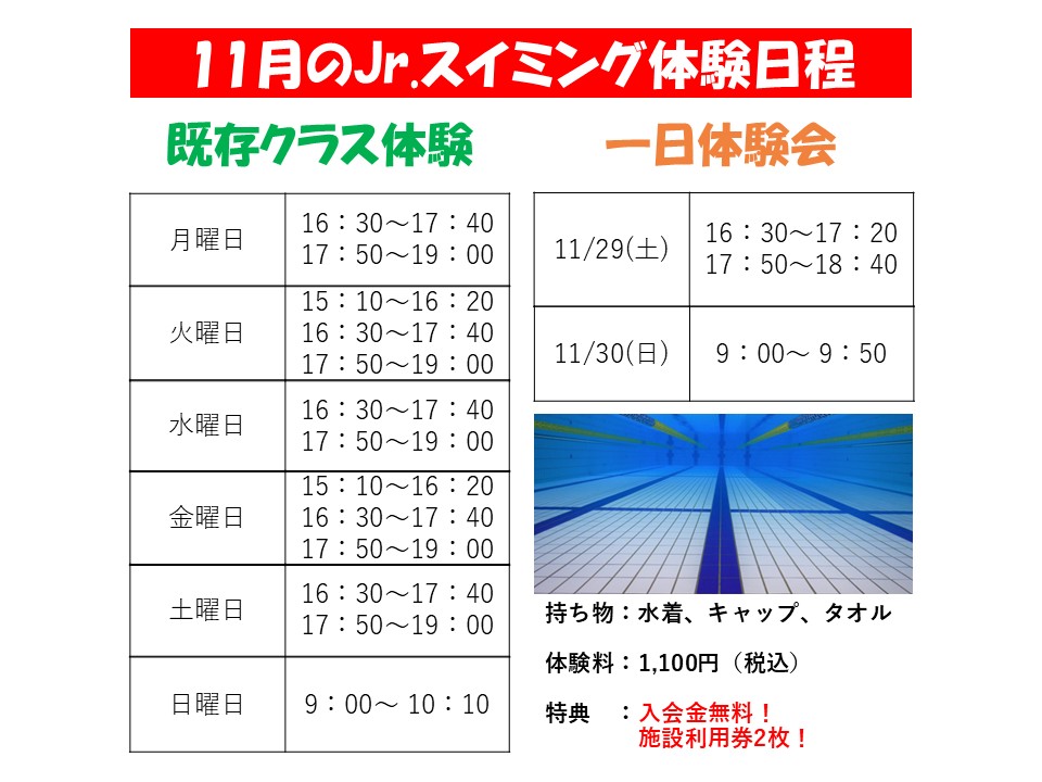 11月のスイミングスクール体験日程!