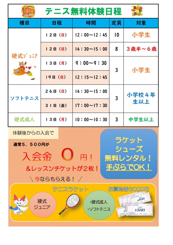 ☆アクトスで開催されるテニススクールの体験日程のご案内になります。