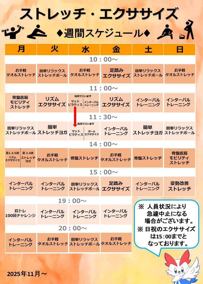アクトスWill水戸では、ストレッチ・筋トレ・調整系など多彩なショートレッスンを自由に受け放題!