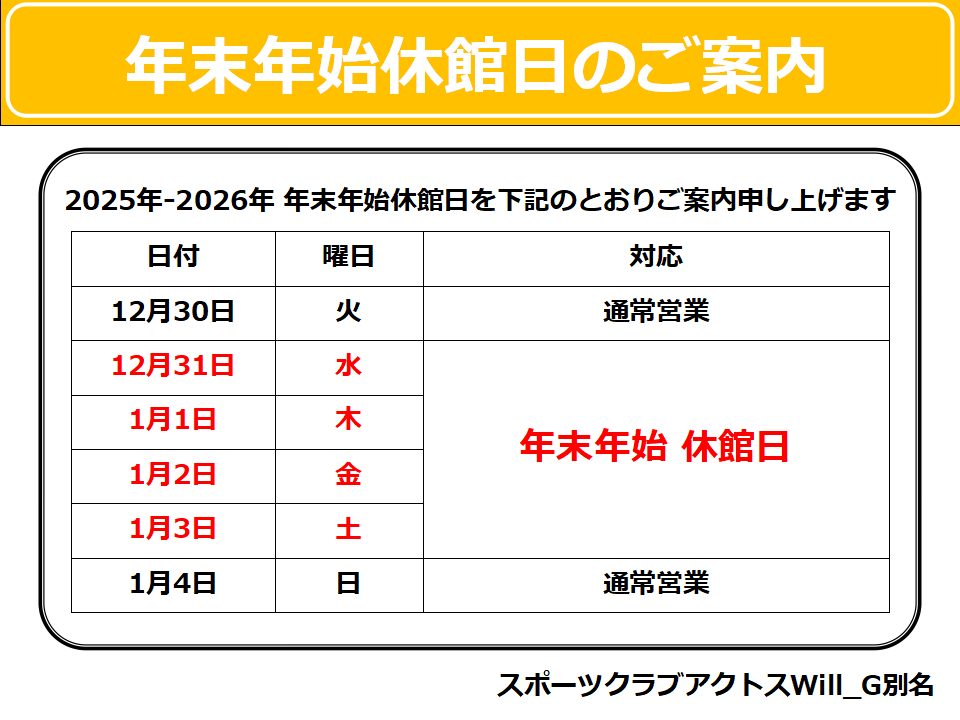 年末年始休館日のご案内