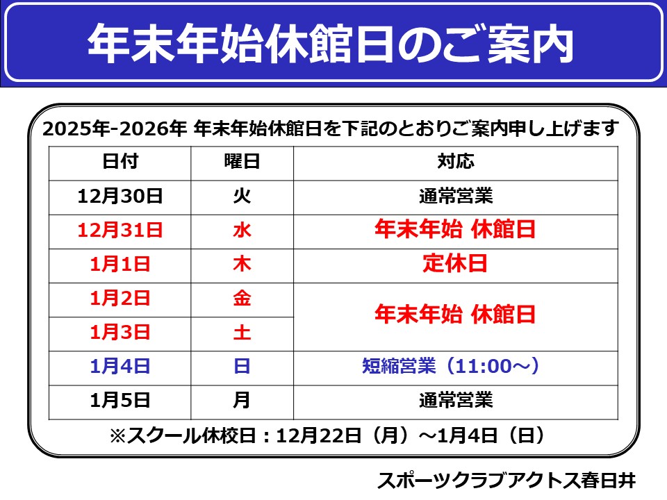 年末年始休館日のご案内