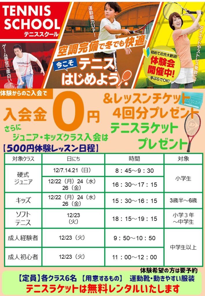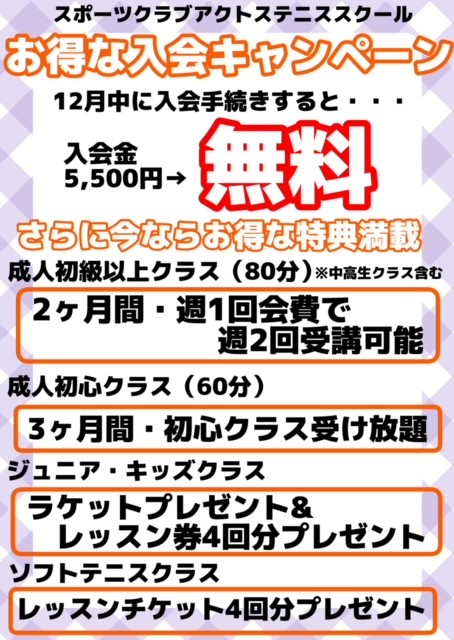 テニススクール今年最後の超お得な入会キャンペーン開催中!体験レッスンも好評受付中!