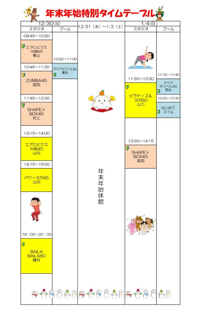 12月30日(火)1月4日(日)スタジオ、プールレッスンについて