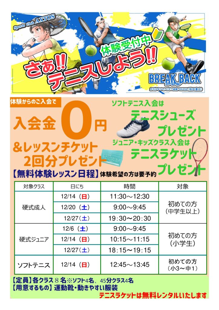 冷暖房完備!快適空間でテニスをしてみませんか?テニス体験レッスンのお知らせ