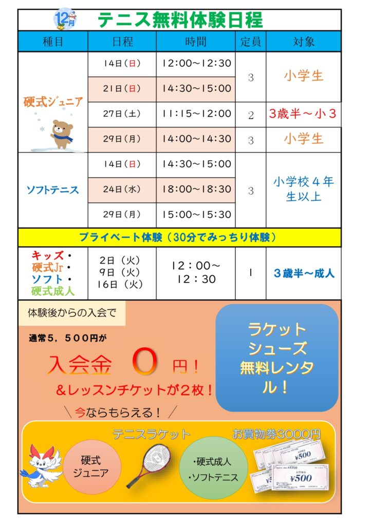 ☆アクトスで開催されるテニススクールの体験日程のご案内になります。