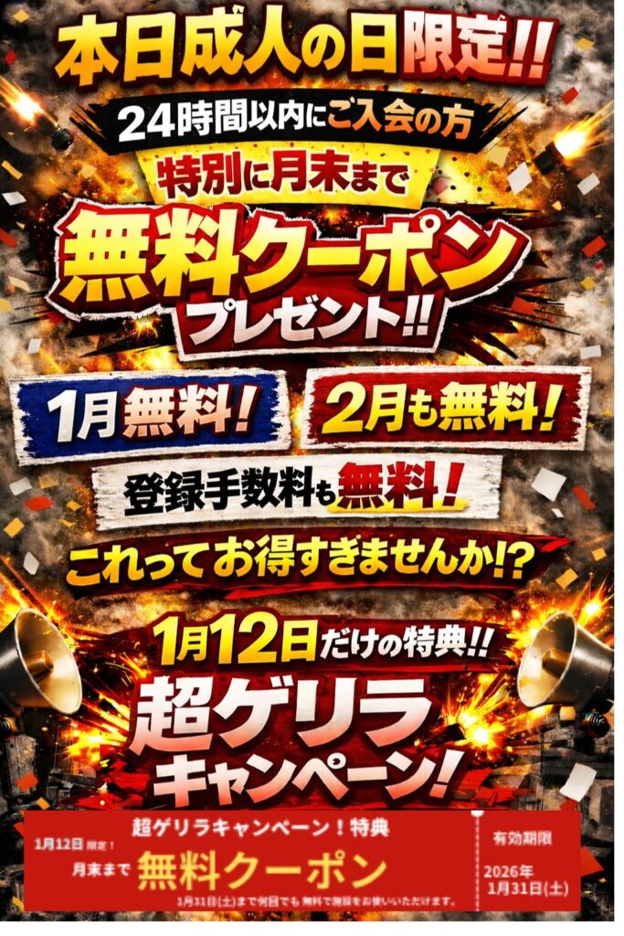HPを見た方だけが得をする!1月12日(月・祝)成人の日 【24時間限定‼】超ゲリラ入会キャンペーン!特別無料クーポンプレゼント!