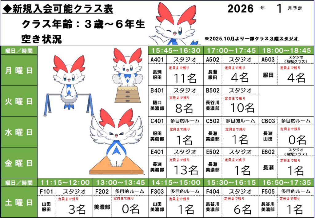 ☆上記はクラスの空き状況となります!