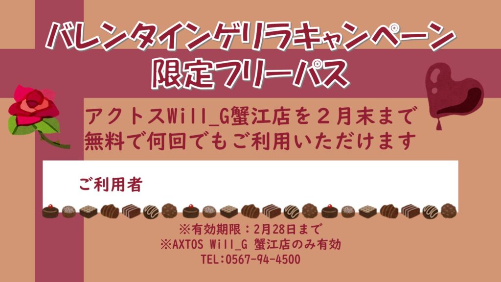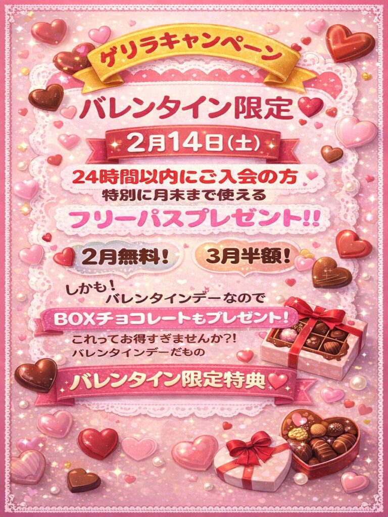 【24時間限定‼】見逃がし厳禁!2月14日(土)バレンタインデー ゲリラ入会キャンペーン!特別無料フリーパス &BOXチョコ プレゼント!
