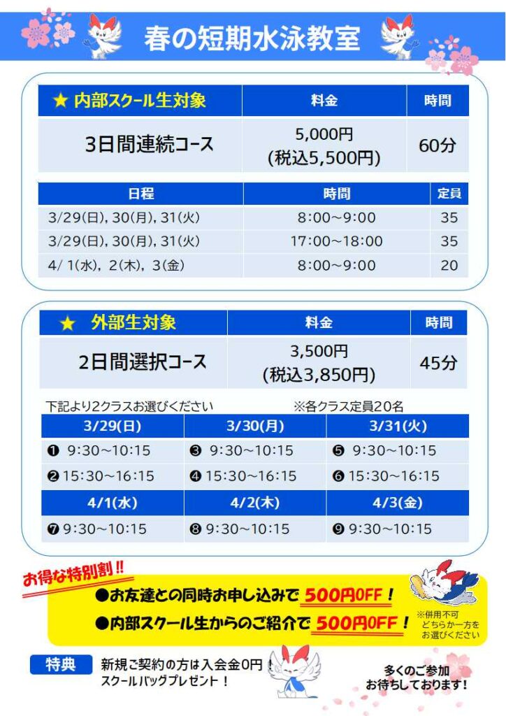 短期水泳教室のお知らせです!!