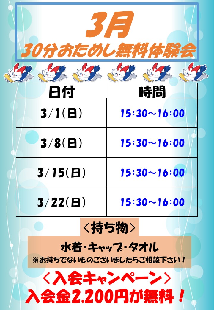 3月ジュニアスイミング体験会を開催します