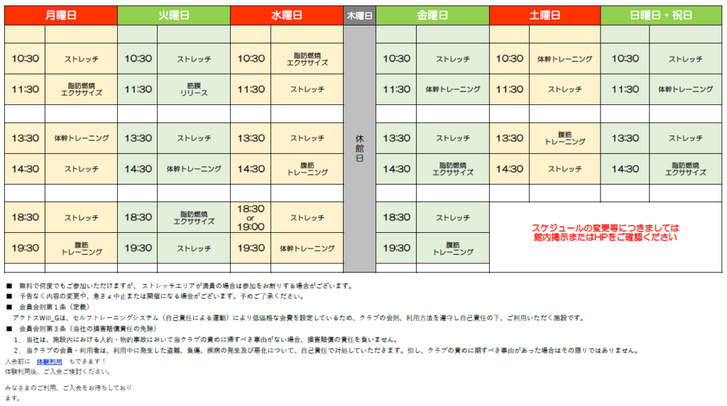 アクトスWill_Gは、セルフトレーニングシステム(自己責任による運動)により低価格な会費を設定しているため、クラブの会則、利用方法を遵守し自己責任の下、ご利用いただく施設です。