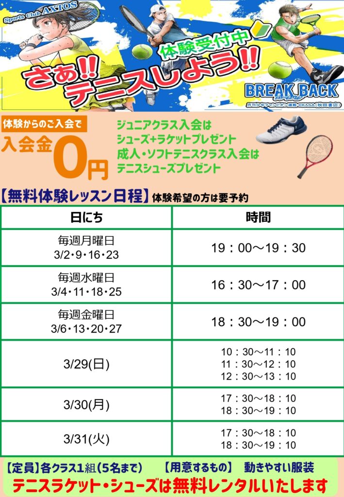 【2月・3月】テニススクール体験日程🎾