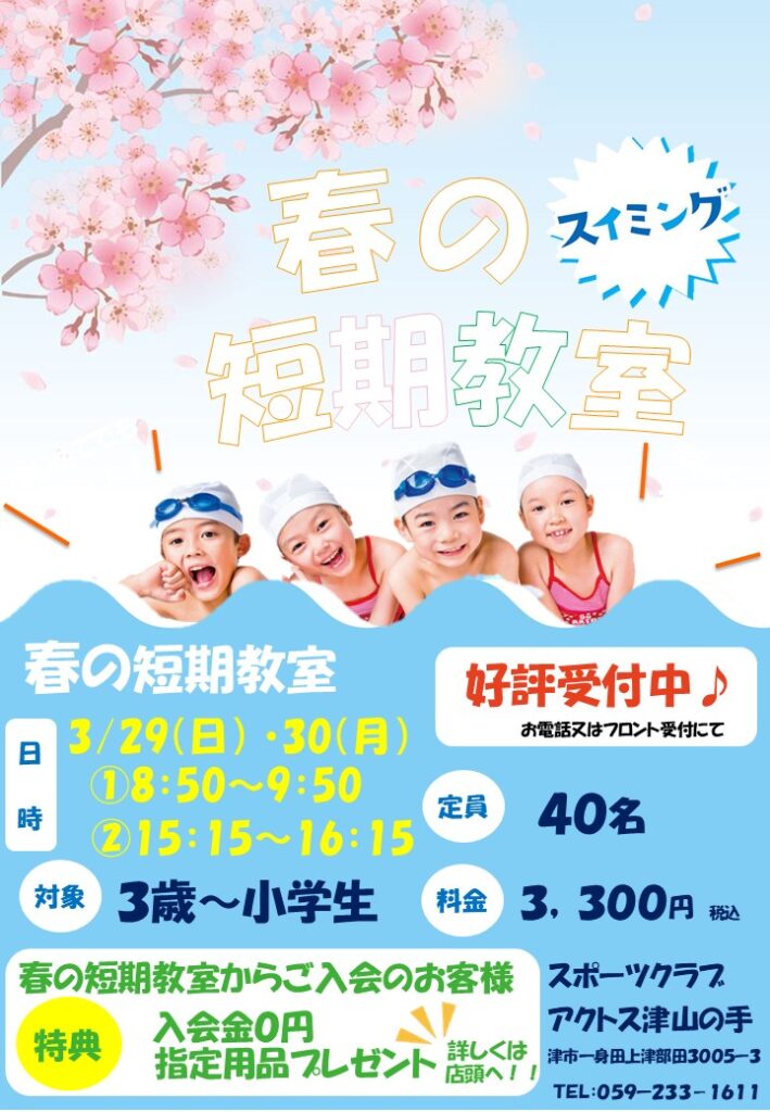 ジュニアスイミング春の短期水泳教室【3/29、30】
