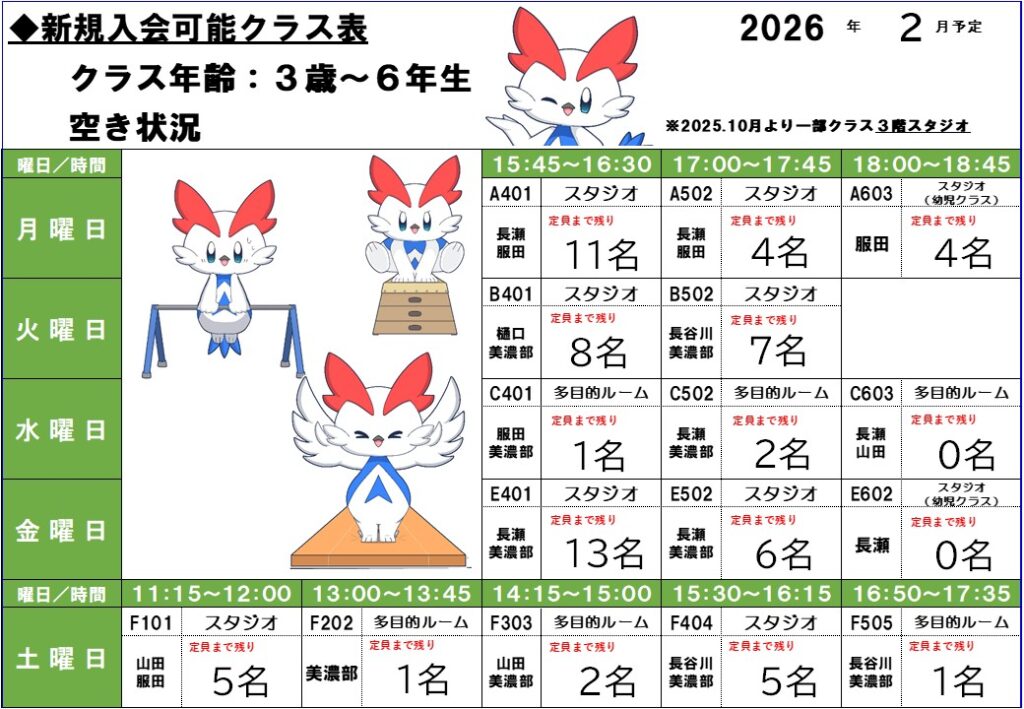 ≪1クラス定員≫キッズクラス→18名 小生生→7名(F202) 幼児→8名(A603・E603)