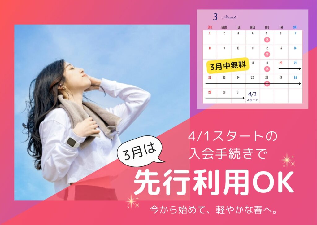 早ければ早いほどお得に!3月のお得な入会キャンペーン『春のスタート応援キャンペーン』今なら先行利用フリーパス プレゼント!月末まで無料で使い放題に!3月31日(火)まで!