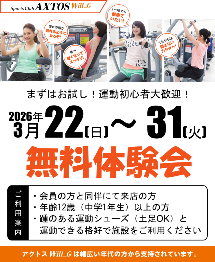 スポーツクラブ入会検討中のみなさま、アクトスWill_Gダイエー武蔵村山店では 3/22(日)~31(火)の9日間、無料体験会を開催いたします。