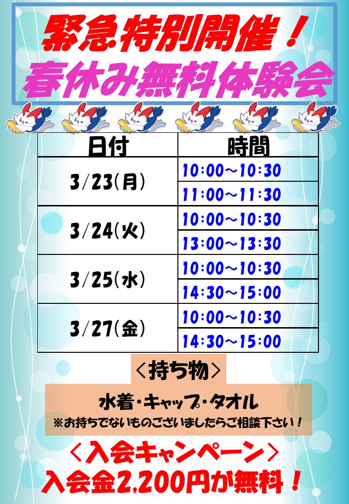 ★3月末★特別開催ジュニアスイミング体験会★