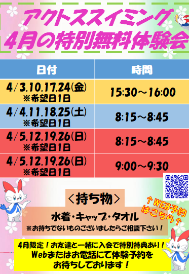 ★4月春のジュニアスイミング30分無料体験会のお知らせ★
