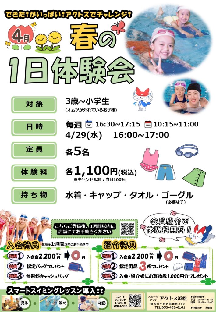 短期水泳教室・1日体験のご予約はWEB又はアクトス浜松店にお問い合わせください。