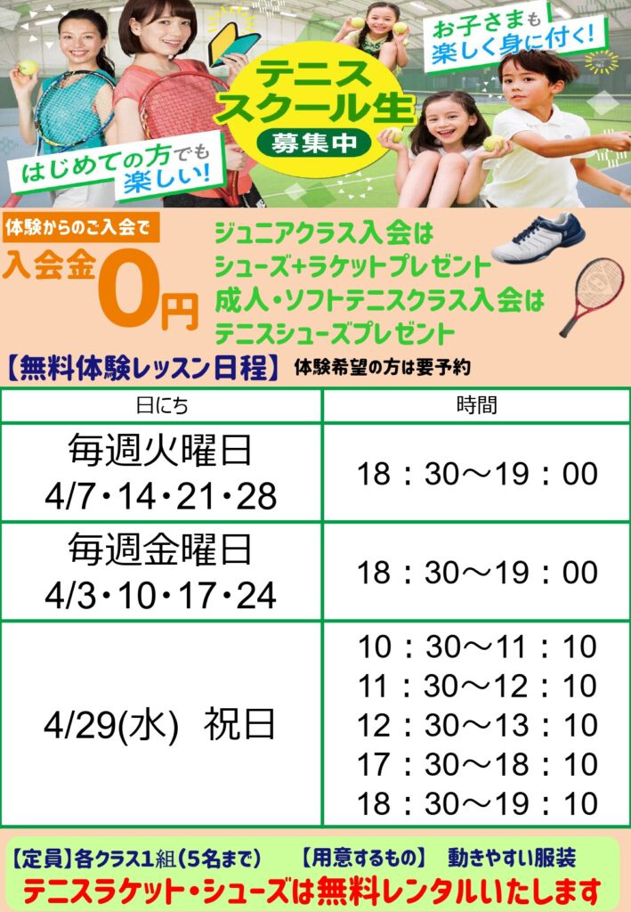 【4月】テニススクール体験日程🎾