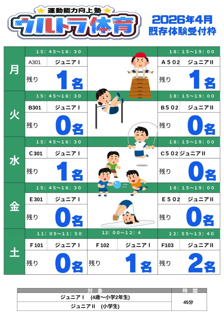 【少人数制】ウルトラ体育 4月既存クラス体験募集中