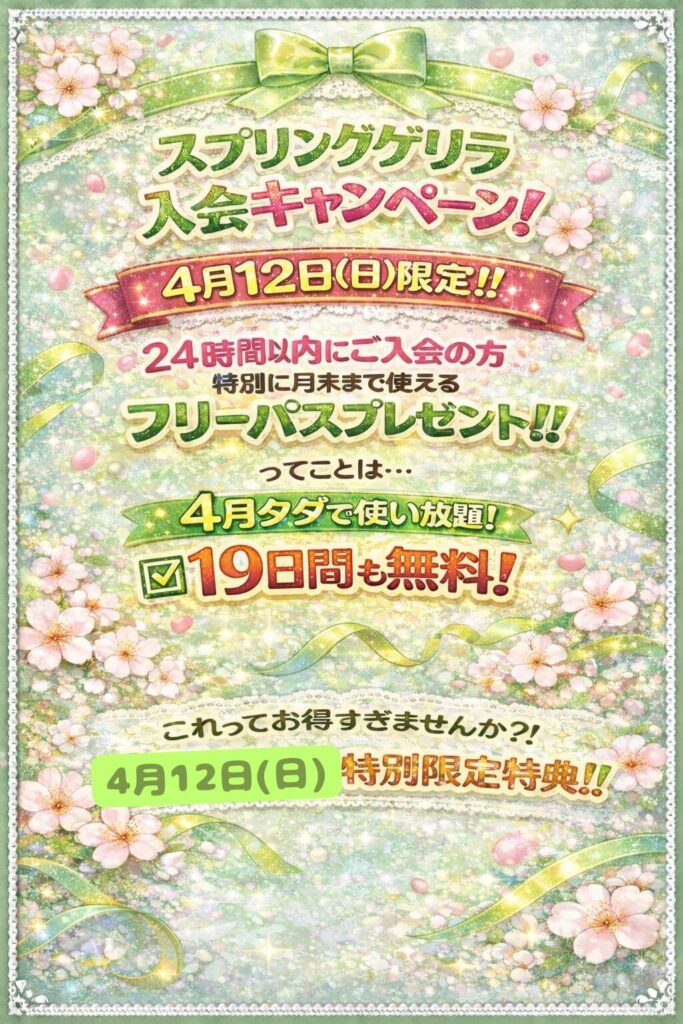 見逃し厳禁!緊急特別開催!4月12日(日)『スプリング ゲリラ 入会 キャンペーン』