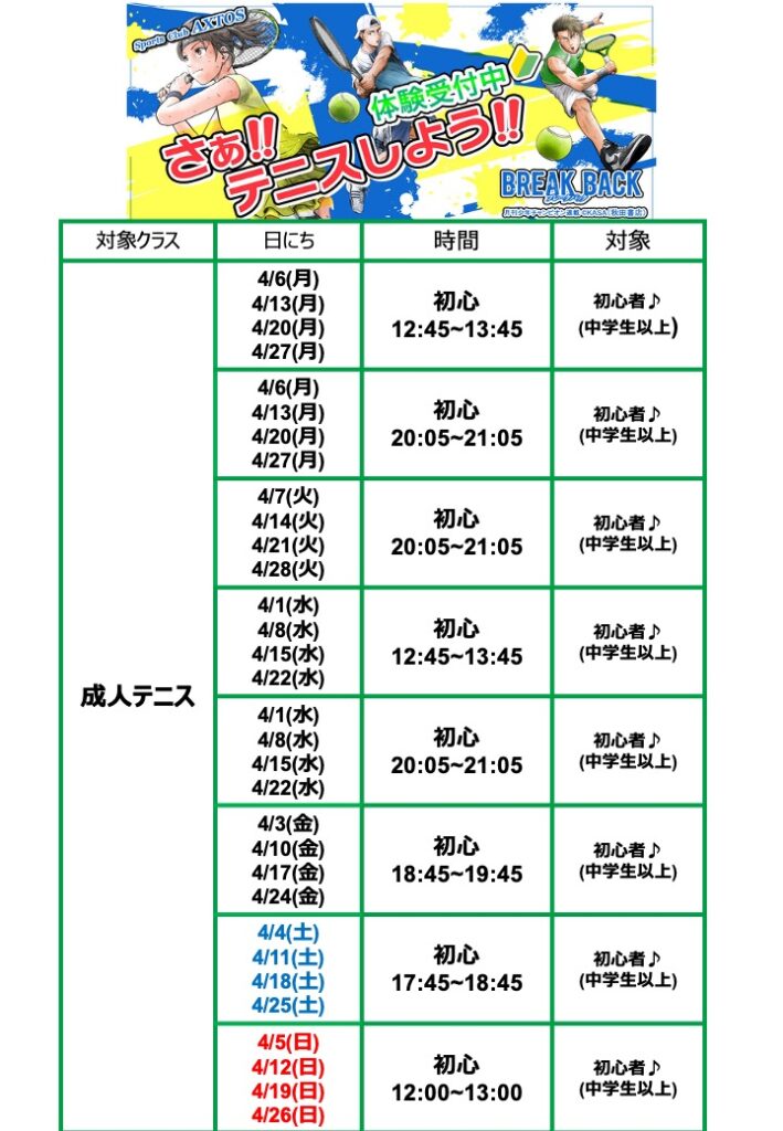【テニススクール】🌸新年度になりました!🌸今こそテニスを始める時ですよ!さぁ!第一歩を!アクトス中川店では初心者のお客様を大募集しております‼️🌟🔰🎾