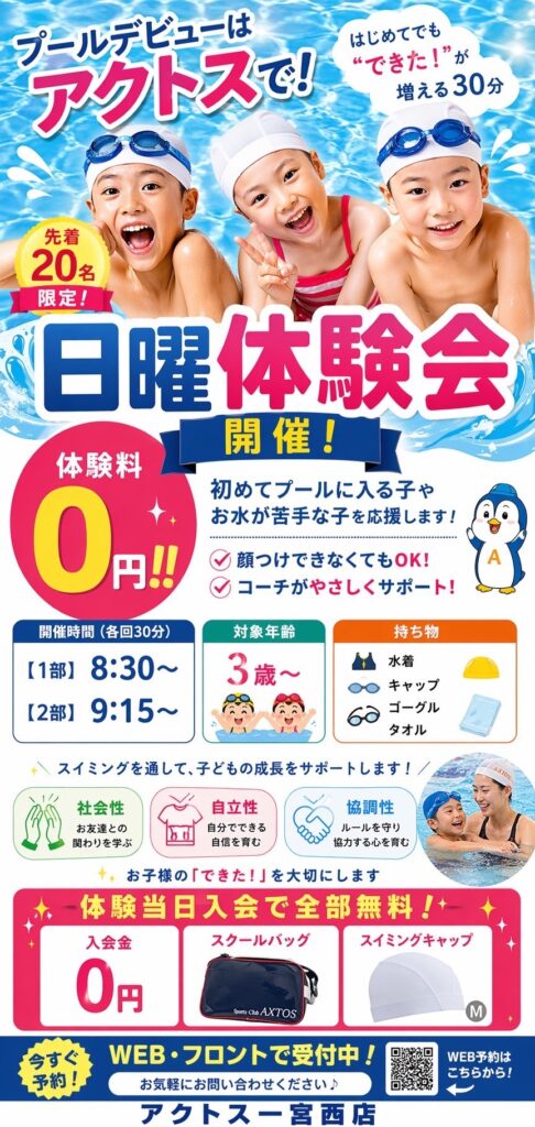 【スイミング日曜体験 ①8:30~9:00 ②9:15~9:45】