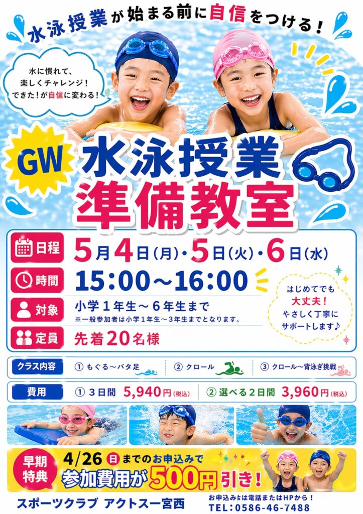 ★水泳授業に向けた準備教室★好評受付中!!先着20名様限定♪