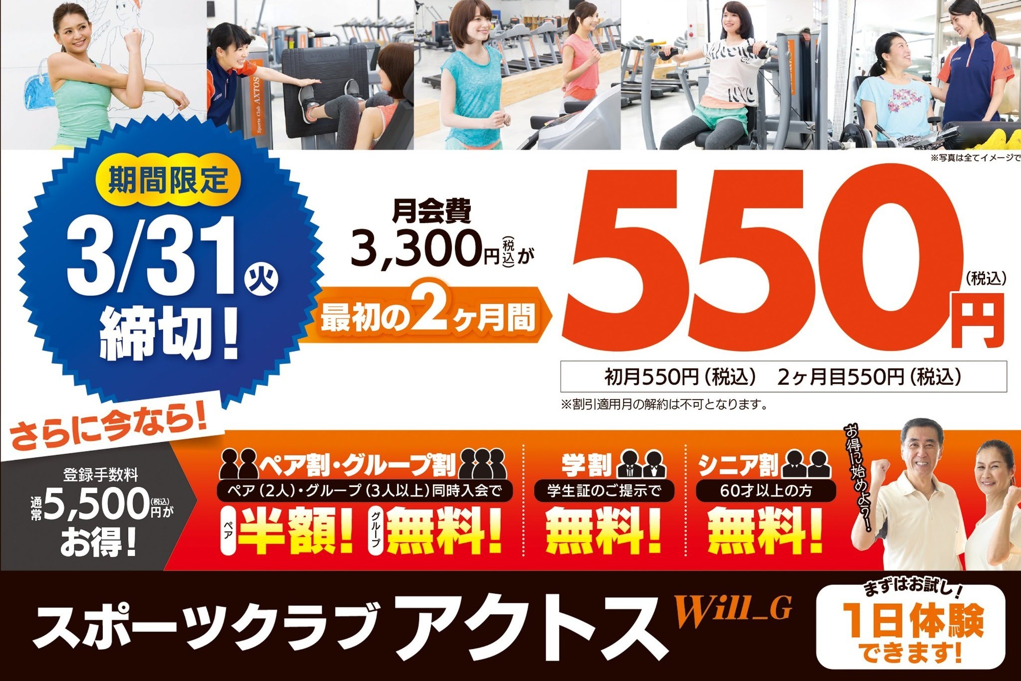 2月入会で月会費3,300円→550円が2ヶ月も続きます!(条件が合えば登録手数料5,500円も割引に!)
