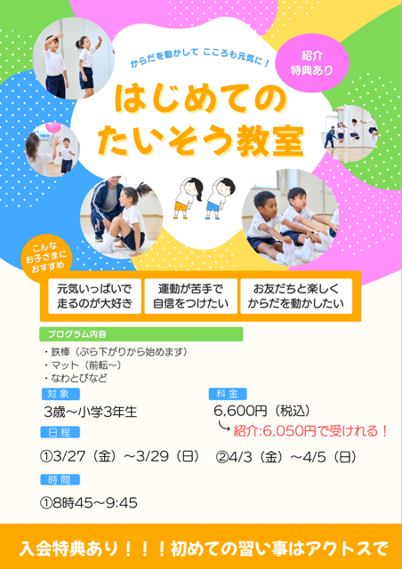 多種多様な運動を体験し、基礎的な運動能力向上を目指します。