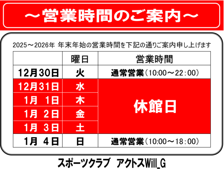 運動しやすい衣服、シューズ、タオル等はご準備ください。※休館日は体験いただけません。