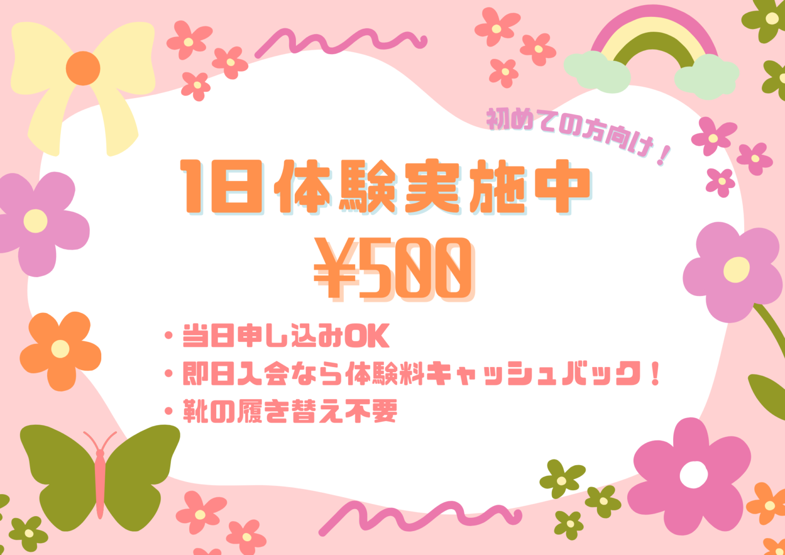 運動しやすい衣服、シューズ、タオル等はご準備ください。※休館日は体験いただけません。