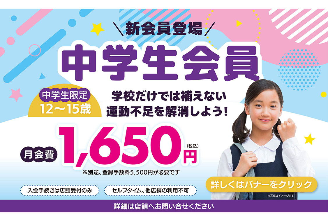6月より営業時間拡大!木曜日も営業実施中♪ 7月より中学生限定プラン開始!地域最安値!親子で入会すると更にお得に! 詳しくは下記店舗からのお知らせをチェック!