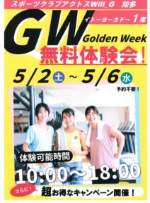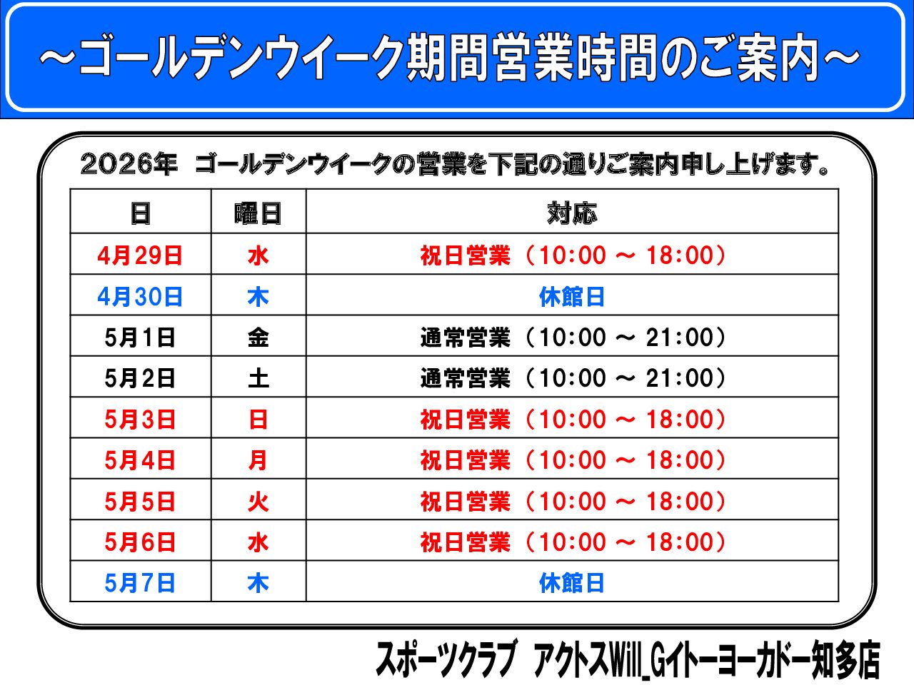 運動しやすい衣服、シューズ、タオル等はご準備ください。※休館日は体験いただけません。