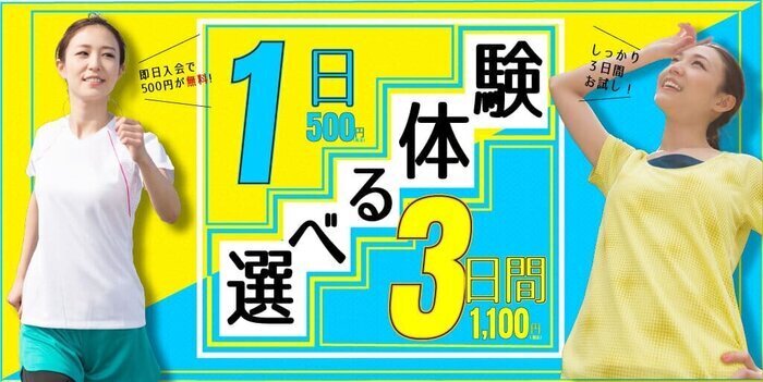 いきなり入会するのは不安という方は、体験利用がおすすめです。施設やサービスをご自身で実感いただけます。キャンペーン等で料金が変わる場合がありますので、事前に店舗へご確認ください。