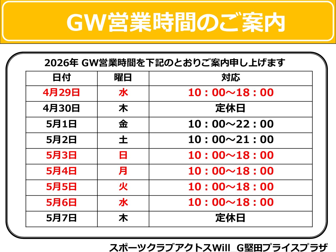 毎週木曜日(他、お盆・年末年始)