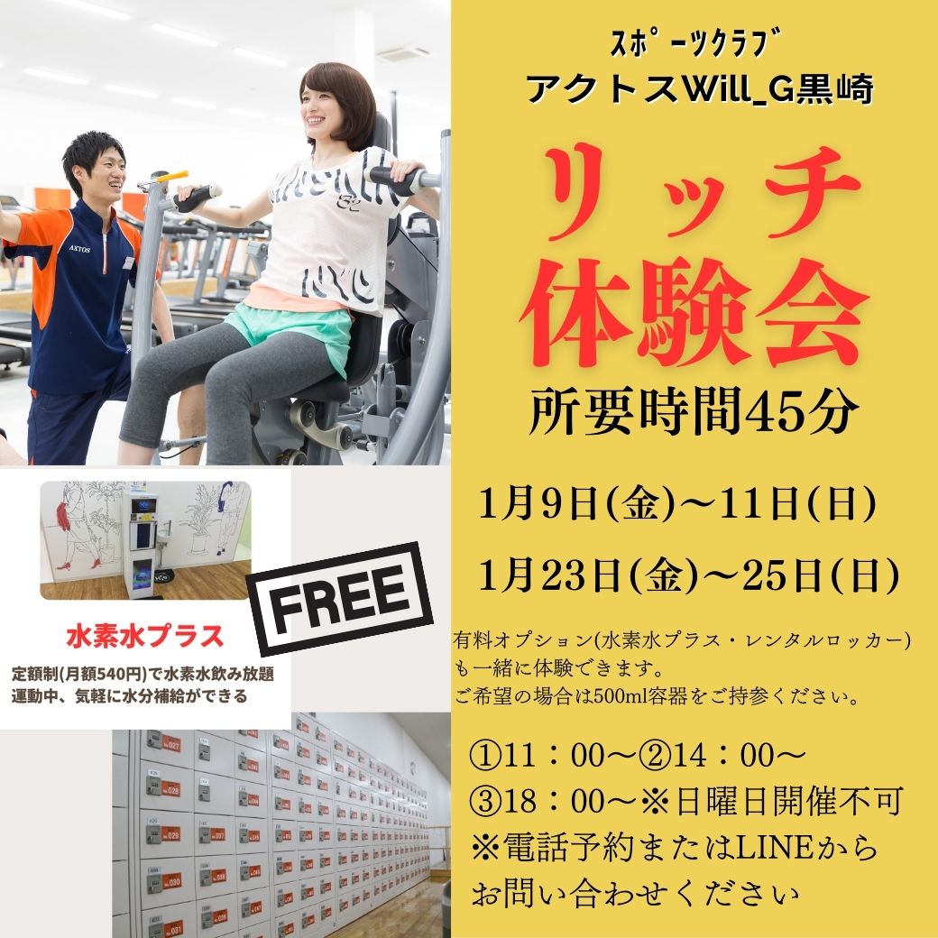 運動しやすい衣服、シューズ、タオル等はご準備ください。※休館日は体験いただけません。