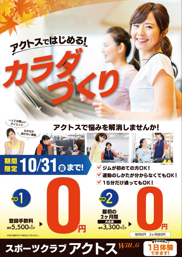 運動しやすい衣服、シューズ、タオル等はご準備ください。※休館日は体験いただけません。