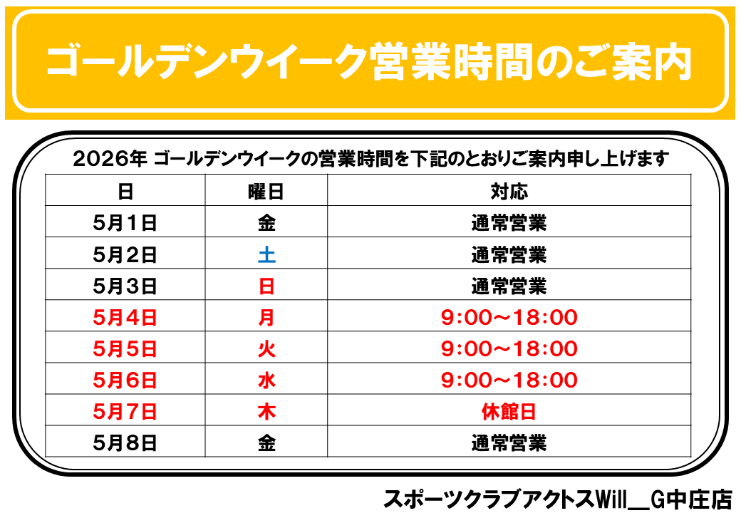 毎週木曜日(他、お盆・年末年始)