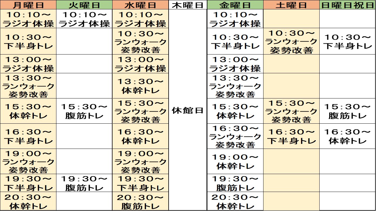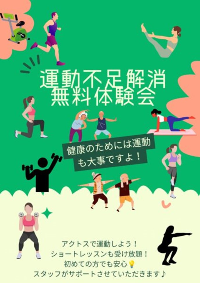 運動しやすい衣服、シューズ、タオル等はご準備ください。※休館日は体験いただけません。