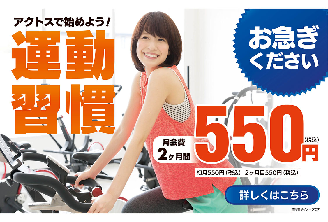 アクトスWill_Gは、ライトユーザー向けのスポーツクラブ。 月会費3,300円(税込)で、月に何度でも使い放題、毎日朝10時~夜10時まで営業中です!守山・春日井地区で低価格のフィットネス・お得なスポーツジムをお探しの方、ぜひ見に来てください。【WEB(スマホ・PC)からでも入会手続できます!】最新情報やキャンペーン、WEB入会手続きについては、下のバナーから!