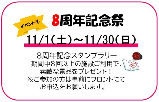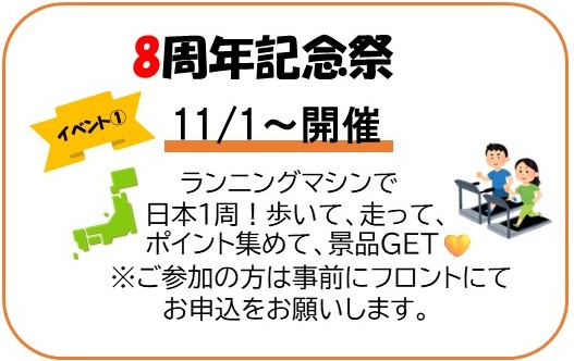 本日10/31(金)最終日!お急ぎください!!10月入会キャンペーンは月会費が初月半額!!しかも登録手数料が0円!!とってもお得に始められますよ!また、関マーゴ店会員様だけの特典!①マーゴの湯、特別ご招待券を毎月お一人さま1枚プレゼント中!アクトスで汗をかいてスッキリ!マーゴの湯でサッパリ1回無料でお風呂に入れちゃう♨②マーゴポイントを付与できます。月会費分のみ毎月15日~末日の期間に関マーゴ店会員証提示でポイント付与!ポイントをためると、【マーゴお買物券】に交換できます。特典いっぱいの関マーゴ店、是非一度、ご見学、体験にご来館ください(^▽^)/ 11月で8周年!感謝の気持ちを込めまして景品がもらえるイベントを多数ご用意しております!是非ご参加ください。