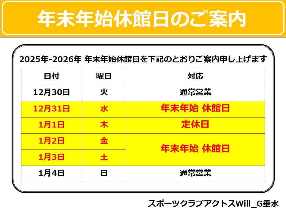 運動しやすい衣服、シューズ、タオル等はご準備ください。※休館日は体験いただけません。