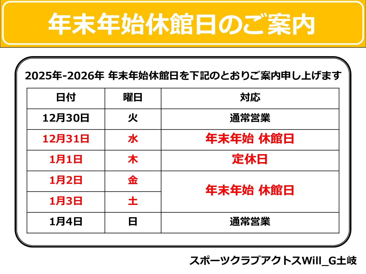 毎週木曜日(他、お盆・年末年始)