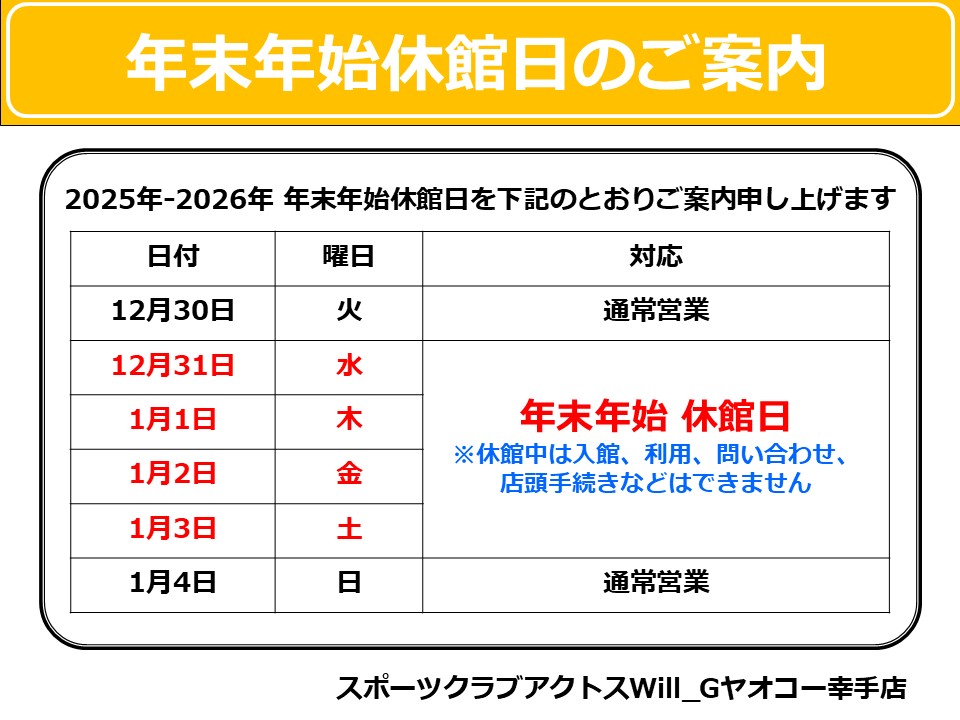 運動しやすい衣服、シューズ、タオル等はご準備ください。※休館日は体験いただけません。